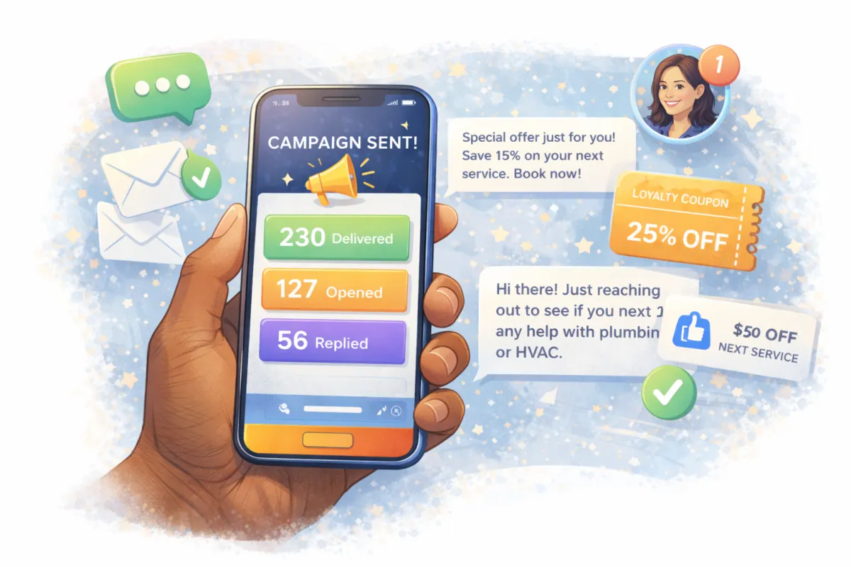 One-click lets the success system instantly reconnect with past customers & leads with targeted text messages that get read & acted on quickly. These campaigns help revive old leads, run timely promotions, & stay in front of the existing audience developed over years to generate repeat work plus immediate sales.